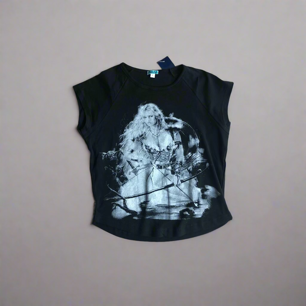 חולצה שחורה בגזרה נשית עם הדפס אישה